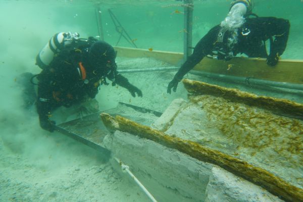Der Sedimentblock mit dem aufliegenden Heck werden mit einer Seilsäge durchtrennt.